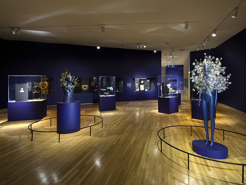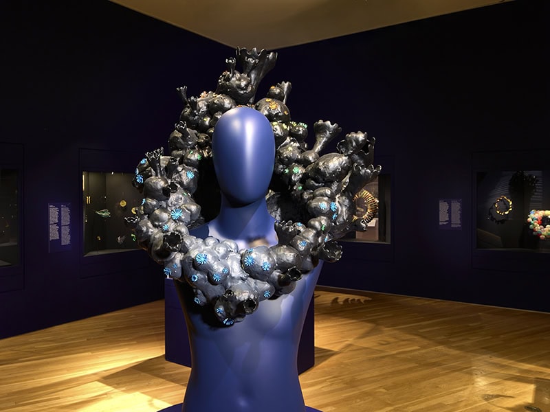 Sarah Schleuning: When fashion or jewelry is in a museum, you study the detail, the craftsmanship, but you lose function and motion. It was important to me to recognize the body, but in the end, the object is the work of art. I wanted to be very clear that this is art, in an art museum, and this work should be shown in a way that is appropriate to this context. For me, the solution was to open the show with two pieces on mannequins, but then they disappear for the rest of the exhibition. I wanted to start with the body and make people understand what the function is, and then show how function becomes secondary to the ideas and the aesthetics.