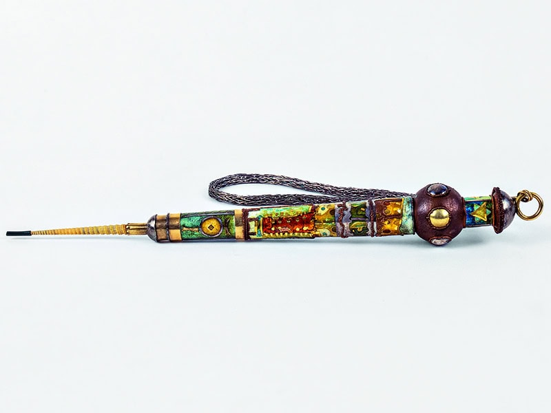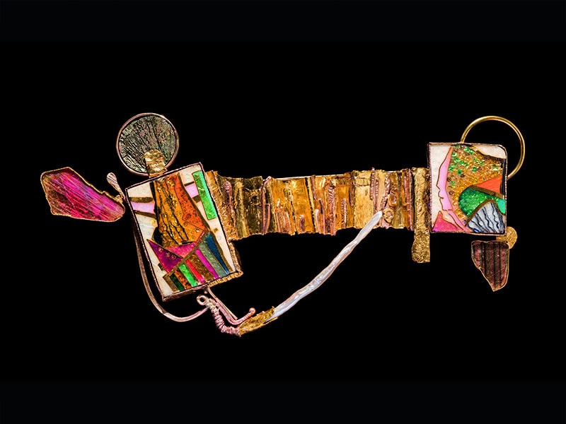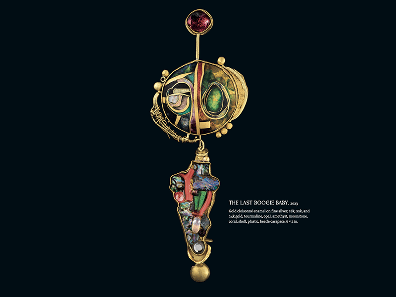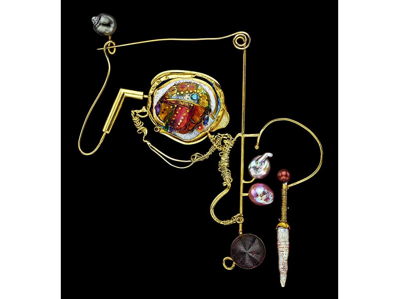 William Harper is a provocateur. His jewelry, objects, and paintings command attention and confront us with unexpected beauty and beguiling assemblages. He is good at this, and the book Bizarre Beauty: The Art of William Harper offers many examples of the ways in which Harper exploits his strategies, from emotive color work in enamels, “jewels,” and gems, to suggestive titles like The Brothel’s Favorite, with its erect shaft of aquamarine. His use of appropriation, recontextualizing natural objects like teeth and claws, feathers and fur, insects, shells, and even a small penis bone, plays with archetypes and elicits our visceral response. We are drawn in by pieces like Pagan Baby #10, with its striped beetle carapace suspended between natural pearls, serving as a scarab “jewel,” a pendant dangling from a fine gold and cloisonné enamel fibula brooch.