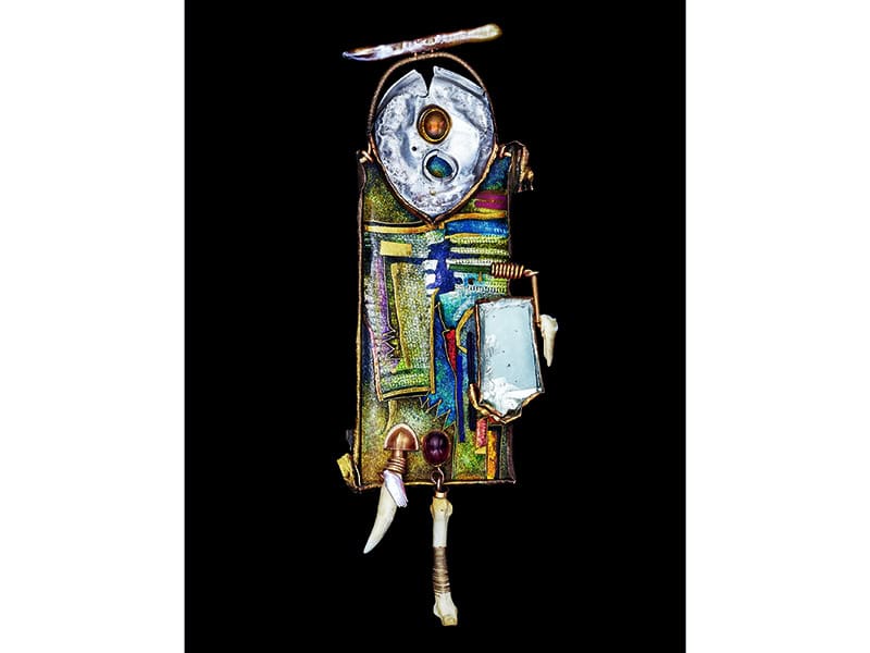 The story also includes the evolution and trajectory of the artist’s practice. Harper’s work is about making objects that express our humanity, transcend time, and serve our fundamental need for art. Early in his career, his perception of “craft” and the work of his contemporaries played an important part in his effort to diverge and differentiate from what was happening in American craft. Harper recounts how, historically, the clean and minimal aesthetics of Scandinavian Modern gave way to new aesthetic values derived from research and experimentation with new materials and methods. He took a different path, however, seeking to imbue his works with the powerful emotional triggers he often experienced when looking at works from other cultures. He took risks, and he challenged more conventional approaches to working with found objects. Adamson notes: “Many jewelers have vigorously contested that bigotry of low expectations, but very few with Harper’s daring, nuance, and intellectual depth while operating entirely independently of what jewelry normally looks like or ‘should’ be.”