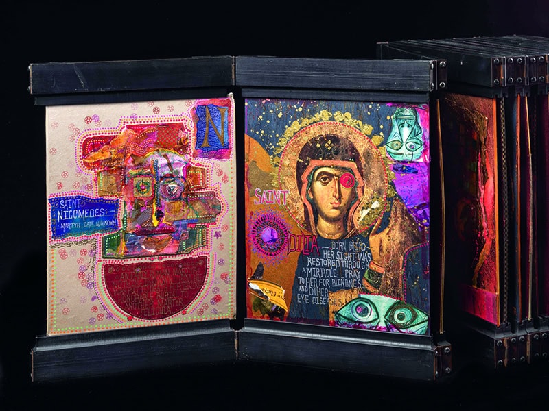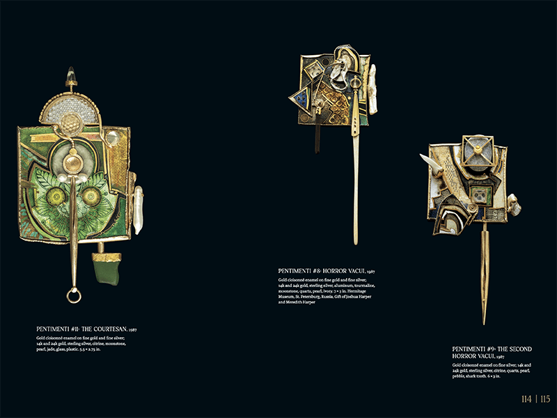 What about inspiration? Where does the work come from and how does the art develop? Like the pieces themselves, some answers are abstract: instinct, allusion, mythology, and religion, among others, all play a part. The artworks and the writing also offer suggestions about the effect of experiences in Harper’s life and his vast knowledge of the humanities as inspiration. Two of the texts by Harper offer more details. He opens the essay “Saints, Martyrs, and Savages” with “These pieces are about religion. They are not intended to be religious jewelry, nor are they anti-religious.” The book offers some intimate details, and leaves room for interpretation, just like the art itself.