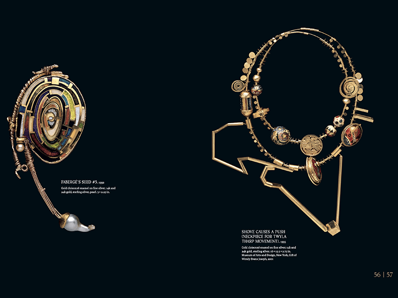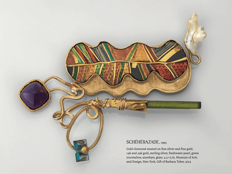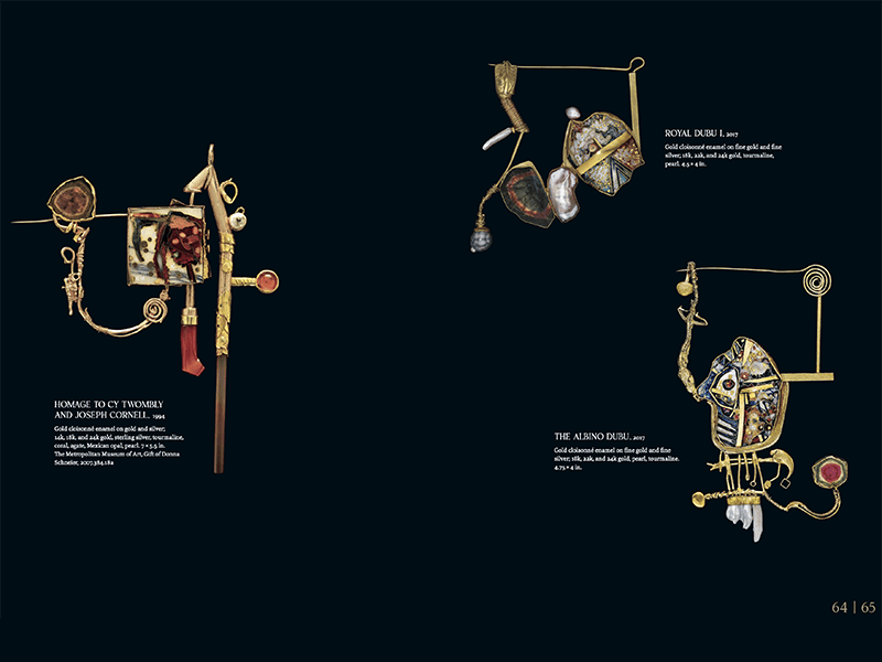 The 10 contributors’ texts address bodies of work without fear of taboo, the profane, or forbidden fruit. Like Baudelaire’s Les Fleurs du Mal, Harper’s work reminds us of the ever-changing nature of beauty, “the flowers of evil,” and our morbid curiosity with the macabre. He pays homage to other artists and exalts anomalies in nature: Scheherazade, an exotic gold and cloisonné enamel brooch with amethyst and tourmaline, is inspired by the ballet that he has known and loved since childhood; Albino I, a gold and cloisonné enamel fibula brooch with pearls, reveres the pale in a palette inspired by the early works of Cy Twombly, which he had seen at the Met, and titled for the genetic condition.