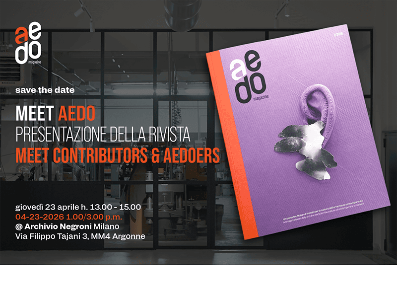On April 23, 2026, a series of one-off sessions presents content and insights into the first edition of aedo, the independent magazine dedicated to the culture of contemporary ornamentation. The magazine aims to be a rich source of information on the topic: a true bridge between Italy and the international scene. Conversations on the boundaries of art, design, graphics, and experimental jewelry with Eliana Lorena, Paola Stroppiana, Sara Barbanti, Francesca Mo, Carla Brusa, Eleonora Tironi, Eliana Negroni, #aedoers & friends. Info.