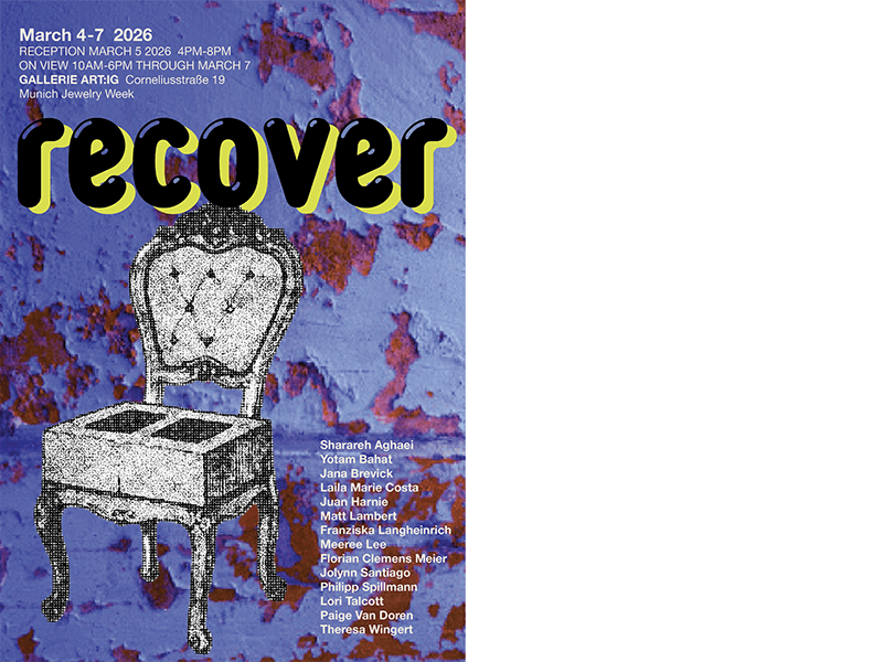 Fifteen creators—among them AJF member Lori Talcott—manifest various aspects of metaphorical upholstery. Upholstering within a jewelry action ranges from protective shields to decorative, cushioned offerings. Going deeper, reupholstering peels back and releases tension. It honors layers and scars that reveal one’s history and tenderness. The work of the invited artists represents multiple interpretations of the theme. Works about digging and covering, exposing or breaking frameworks, and binding together. At Galerie art:ig. Info.