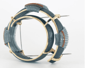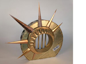 The entry, called Camouflage, consists of a necklace and a brooch made of crab shells that the artist picked at the shore in Sweden last summer. “Although the patterns blend into the surroundings, sometimes the camouflage fails,” states Björkman. “Hungry birds catch the crabs and swallow everything except the shells that remain. Jewelry is not always associated with camouflage, but it can certainly function as such. It can harmonize with a wearer’s identity, be a social code, and a symbol that protects and reinforces a person’s strengths and weaknesses.” Bjorkman serves on AJF’s board. Her gallery, Platina, is an AJF member gallery.