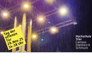 Explore the workshops and meet the students and teaching team. Alongside exhibitions showcasing works from the fields of jewelry and gemstones, artistic design, and photography, the students will host a sale of jewelry and objects. Also: Cabinet of Risks & Chances, a guest exhibition by Christoph Zellweger, as well as the outcomes of the project BUUUHM – Design with Dynamite, recently created in the Juchem quarry, in Niederwörresbach. Questions? Email here.
