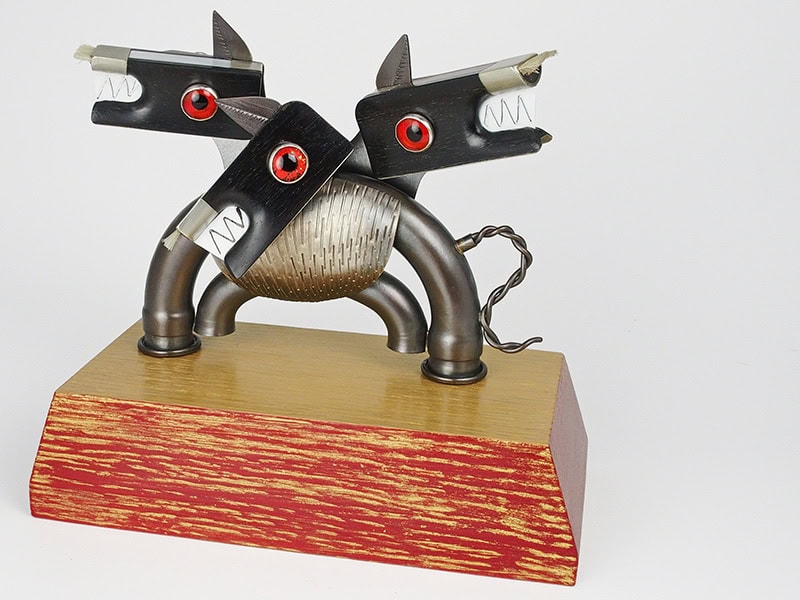 The artists’ first exhibition in four years, on view at Philadelphia’s Gravers Lane Gallery, was a big success. “They sold one of their biggest pieces on opening night! The sea serpents seem[ed] to be the favorites,” said gallery employee Mia Chen. Calliope symbolizes their convergence of concepts and imagery taken from Greek mythology, the circus, and carousels. Emphasizing fantastical creatures composed of brass wind instrument parts combined with their fabrications, the works are irreverent, metaphorical, and playful, evoking notions of youthful wonder and discovery. More.