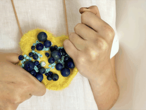 The maker participated in Bridget Kennedy’s annual project, Remade-Reloved, with the creative challenge of designing new jewelry from unwanted costume jewelry. A frequent writer for AJF, Mason referenced this quote from a meteorologist as she fabricated her amulets and talismans: “Unfortunately, we can’t squeeze the cloud … to wring out as much moisture as we can.” More, in Garland.