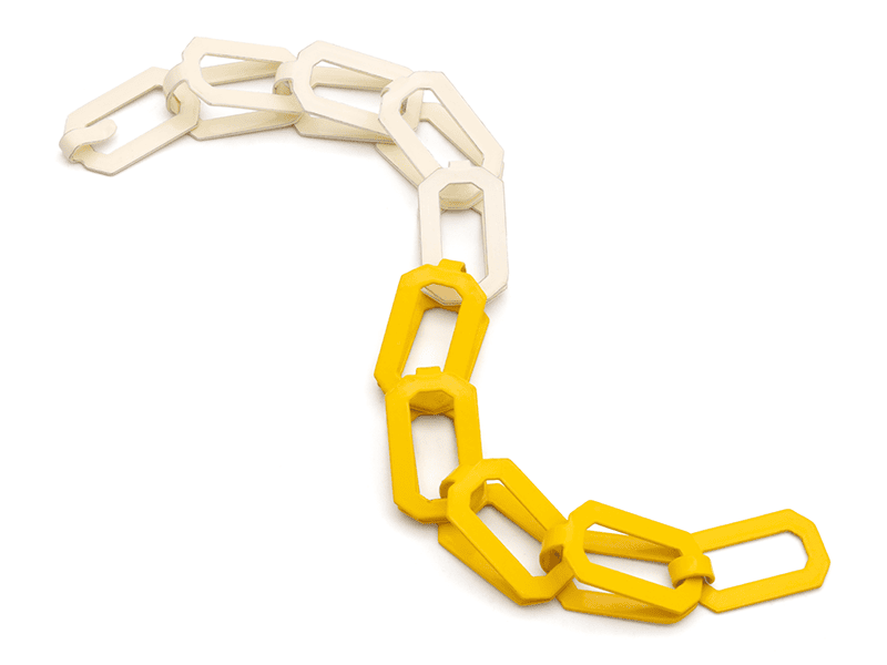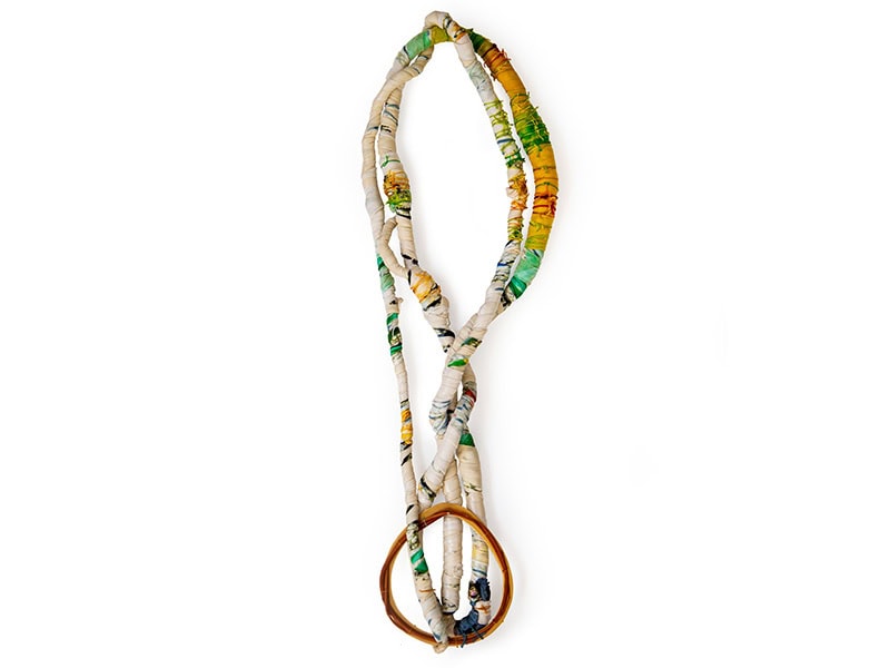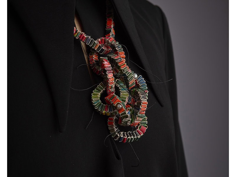 Jessica Winchcombe’s jolly, colorful, and elegant necklace is made with textile, taking strips of canvas, cut out from Winchcombe’s large original acrylic painting and folded, creating yet another expression, further ornamented with threads and pearls, arriving at a fantastically unique presence.