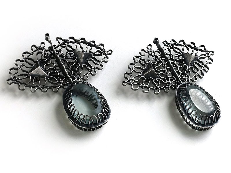 These pointed earrings by Munich-based artist Nicole Schuster perfectly balance rigid geometry with organic shapes. “I utilize both deliberate formations and the inherent flow of nature to render symbiotic landscapes,” states the artist. “My pieces often feature organic elements sprouting from inanimate forms and constructions.” Schuster’s work beautifully captures both an edgy darkness and a feminine softness.