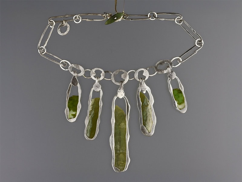 Jacqueline Morren was born in The Netherlands. After extensive travels, she arrived in New Zealand, where she became acquainted with the precious stone Pounamu. During her visit, she attended a night class in jade carving, and after returning to The Netherlands was overcome by a strong desire to work with this material again. She returned to New Zealand as an international student and earned a diploma in jade and hard stone carving. Morren wanted to incorporate metal into her craft. After searching for a silversmith to collaborate with and coming up short, she decided to develop her own metalsmithing skills to combine both materials. This set the foundation for her own ethically based jewelry practice. She continues to live and work in New Zealand.