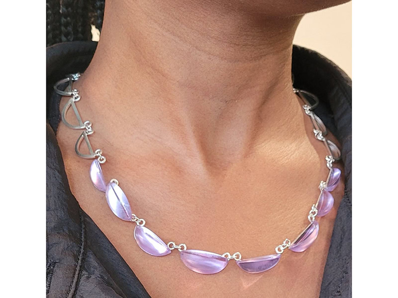 Luminous violet glass crescents are linked together with a hand-fabricated sterling silver chain of the same shape in this statement necklace by AUR Jewelry. Crafted by artist Bianca Abreu, this piece was featured in Specific Gravity’s NYC Jewelry Week 2025 exhibition, Divinations, within Abreu’s Orbiculum I, a wooden jewelry case illuminated by a blown-glass “crystal ball.” The interplay of glass and light transforms this necklace into both object and oracle, evoking divination as a meditation on that which is below the surface. Abreu received her BFA in sculpture from Pratt Institute and is currently a resident artist at Brooklyn Metal Works.