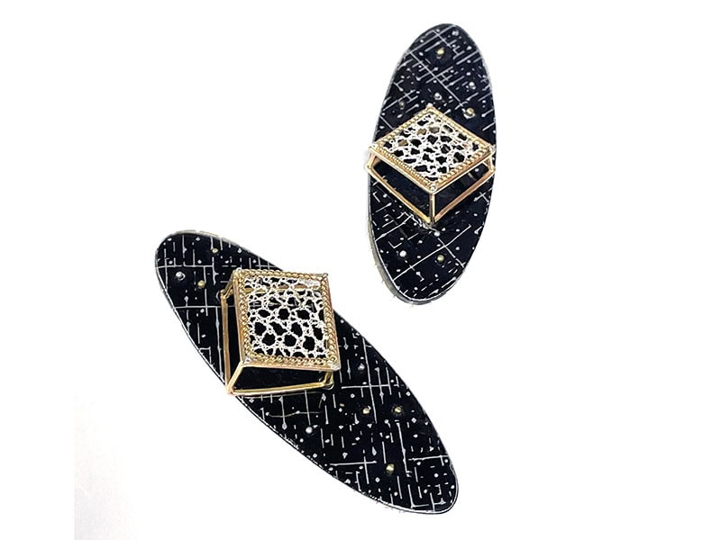 Alicia Jane Boswell’s work blends the traditional crafts of silversmithing, goldsmithing, enameling, engraving, and lacemaking with contemporary digital techniques like 3D rendering and laser cutting to create innovative, wearable jewelry. Through this fusion of methods, she explores the intersection of craftsmanship, technology, and personal expression—where the tactile meets the digital.