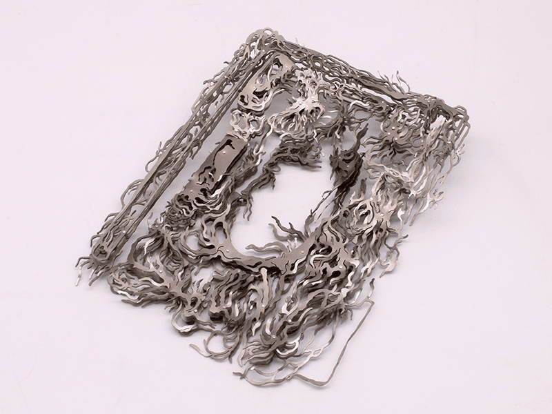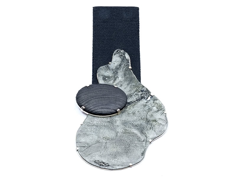 Helena Sandström is known for taking her own paths. She chooses nontraditional materials and techniques with care, as, for example, the metal zinc. Since zinc cannot be soldered in the usual way, she creates volume from the flat sheet by melting, sawing, and folding. She also works with etching to create patterns and a variety of beautiful shades of gray in the metal. Her work often comments on nature and environmental issues in different ways. Sandström is a jewelry artist from Stockholm, with an MFA from Konstfack, University of Arts, Crafts and Design, in 1997. She has her studio in central Stockholm.