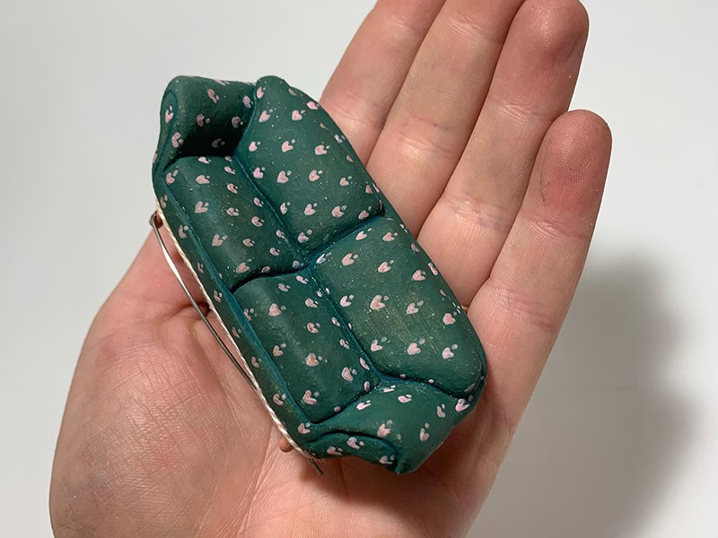 This piece is a fun play on scale and the objects we interact with on a daily basis. A couch is usually a utilitarian object, but this brooch gives you a chance to wear it instead!