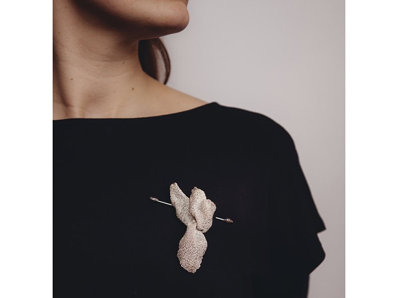 Gossamer Brooch I is a unique, most original brooch made of organza fabric, copper, silver, and shibuichi, produced through Michaela Pegum’s extraordinary complex electroforming process, ending in an exquisitely beautiful object. A wearable art piece, done by an incredibly talented artist whose work spans sculpture, wearable art, and performance.