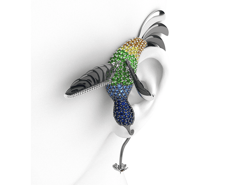 From the artist: “This earring was inspired by the innate elegance of Nature, the fascinating movement of living beings, and the amazing colors they display. During my stay in California, I had the chance to see and admire this elegant and amazing creature in person for the first time in my life. [Eleonora Federici is from Italy.] What a wonderful, incredible animal! Not only did it embody exactly what I wanted to represent, but it had all the characteristics I look for in a jewel. So I could not help but dedicate a jewel to it. It is my way to show how human beings and animals can live together respecting and loving each other.”