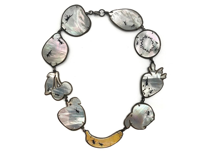 Etched mother-of-pearl comes to life with this statement necklace by Kelly Jean Conroy. Each unique element is etched by hand and then prong set in oxidized sterling silver. A playful piece that is perfect to wear to a picnic!