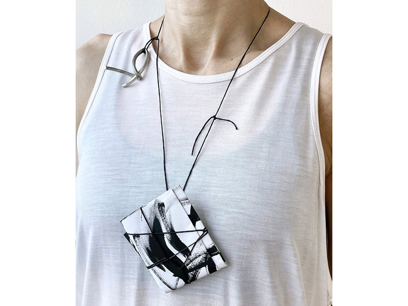 “Human Patterns #11, from 2024, is part of a jewelry project initiated in 2008 and inspired by the multiple ways through which human beings communicate and relate,” states Leonor Hipólito, “from gestures and symbols to the objects and technologies that mediate our encounters. This one-of-a-kind pendant exemplifies [my] artistic approach. Deliberately fragmented, it features what could be a paper note, a drawing, or even a sketch that was wrapped and concealed, as if encoding a mystery—something once more complete.” The Human Patterns project has been featured at Goldfingers gallery, in Copenhagen, Denmark; Viceversa gallery, in Lausanne, Switzerland; and now Galeria Reverso, in Lisbon, Portugal.