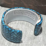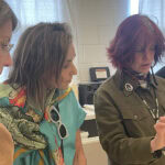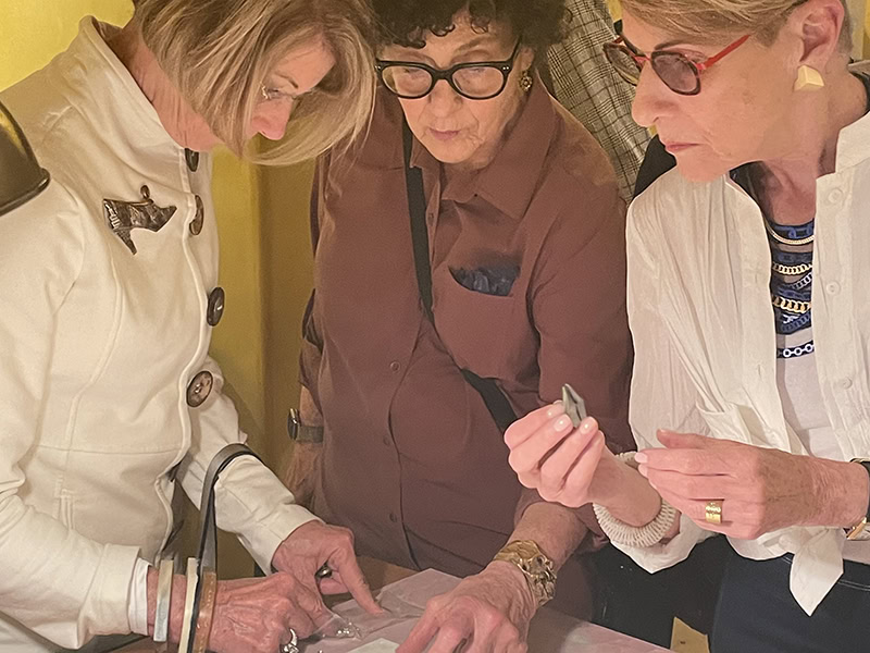 Art Jewelry Forum took 17 travelers to Santa Fe, in the high desert of New Mexico, May 12–15, 2025. The temperatures were mild, the downtown area lush and green, with blooms everywhere. Garlands of dark red dried chiles festooned the buildings and lampposts. Our focus was on Native American jewelry. We saw so many beautiful wonderful pieces in the museums we visited, and learned so much from the curators who met with us! It was fun to watch the travelers sweep into the various locations we visited, adorned in their superb brooches, necklaces, earrings, and bangles. In one museum lobby, I overheard a group of people talking. Who are all those well-dressed people? one asked the others. Did you see their jewelry?