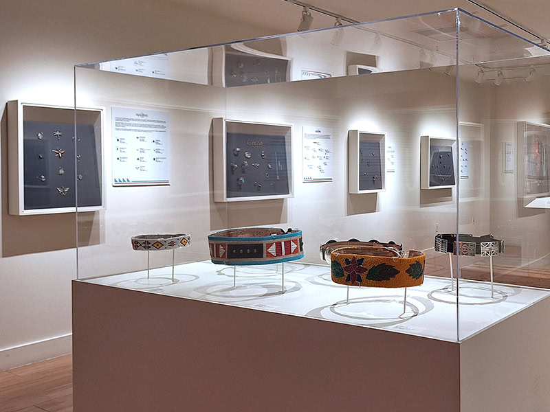 The final room focuses on storytelling, and it contains cases that each focus on regionally or culturally specific work, such as that made in the Southwest, Northwest Coast, and by members of the Native American Church, as well as work that serves certain cultural functions, such as crowns for Native pageant royalty, cowboy/Western culture, and conceptual and political work.