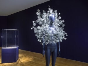 In addition to the video walls and paint/process visuals, two big walls show images of models wearing the neckpieces. They explore a kind of emotional interaction between the wearer and the worn piece, clarifying their scale and relationship to a body.